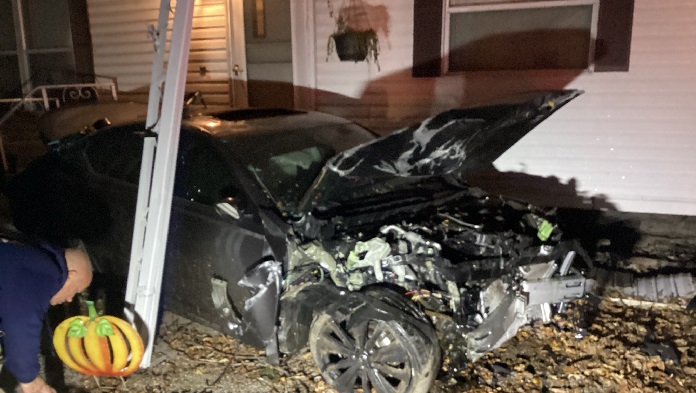 The vehicle had gone off the road and struck a mailbox, power pole, landscaping, and a parked vehicle before coming to rest against the residence. When striking the parked (unoccupied) vehicle, that was pushed into the trailer, moving it nearly a foot. The power pole was completely broken and Midwest Electric arrived to replace the pole.
