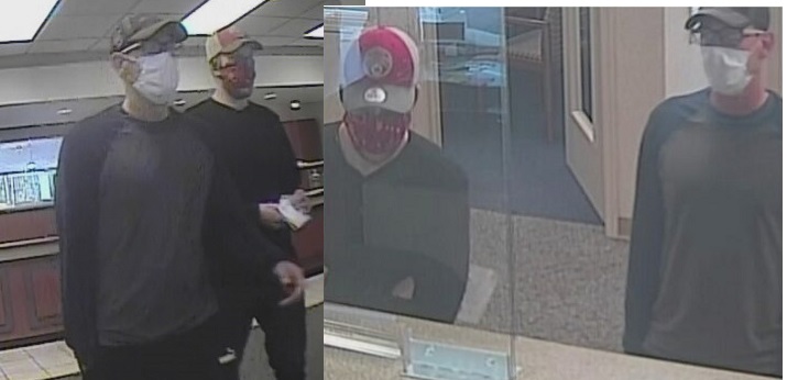 Two (masked) white men walked into the bank and presented a note to the teller demanding cash.