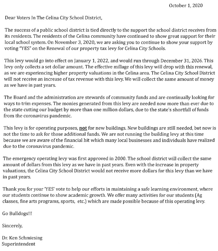(10-1-20) Dr. Kenneth J. Schmiesing, Superintendent of Celina City Schools sent to media sources this morning the following letter asking for the support of the greater Celina community on the renewal operating levy, which is on the November 3, 2020 ballot.