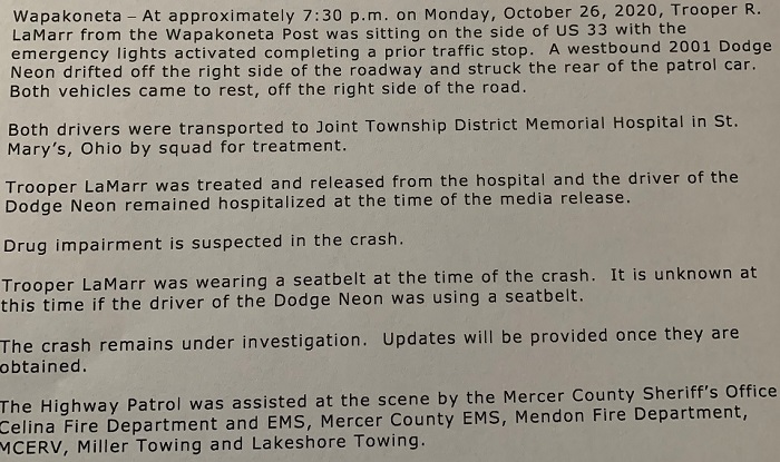 (10-27-20) Last night an Ohio State Highway Trooper LaMarr was injured when his patrol car was struck by a vehicle as he was parked on the side of the road completing a traffic stop.