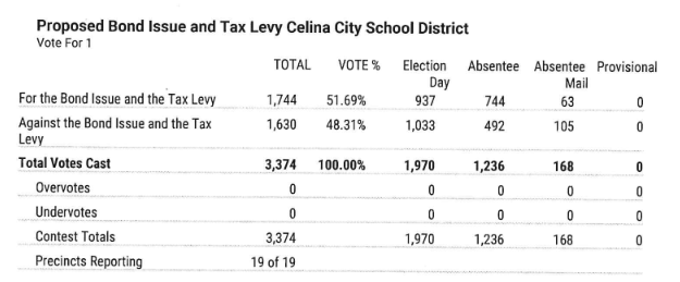 Unofficial results show that 51.69% voted for the levy, while 48.31% voted against it (1,744-1,630). The vote received a lot of attention during the campaign with what the exact cost would be to voters.