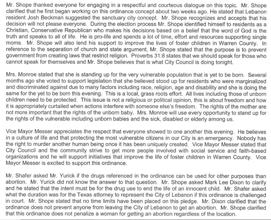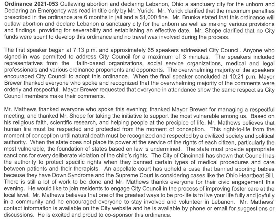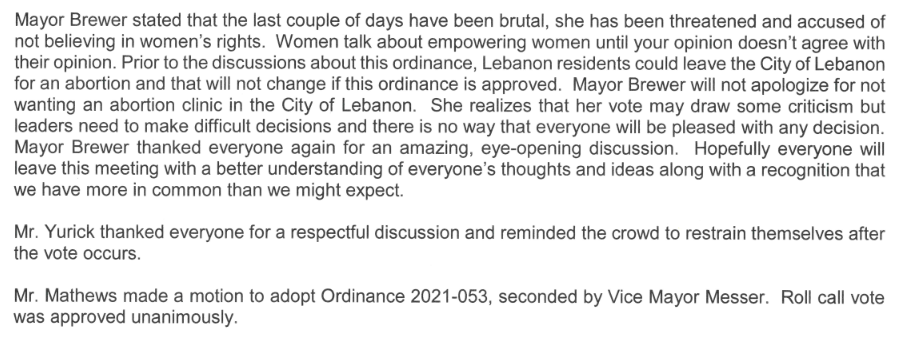 On May 25th the Lebanon, Ohio City Council passed legislation that would not allow for an abortion clinic in the city.