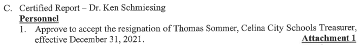 (6-18-21) Monday night at the Celina City Schools Board of Education meeting the board will act on the resignation of current treasurer Tom Sommer.