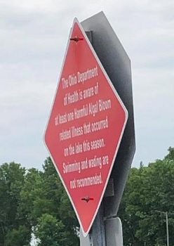 The sign reads – The Ohio Department of Health is aware of least one harmful algal bloom related illness that occurred on this lake this season Swimming and wading not recommended.
