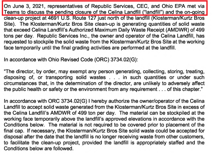 A June 3 meeting with the Ohio EPA mentioned the impending landfill closure. in the exemption approval seen below