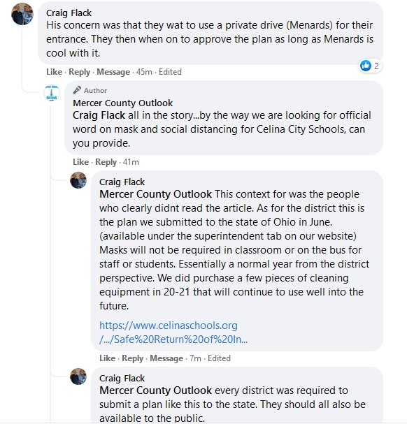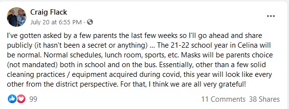 (7-23-21) A day after a Celina City Schools Board of Education Meeting…Board President Craig Flack posted the following on his personal Facebook page-