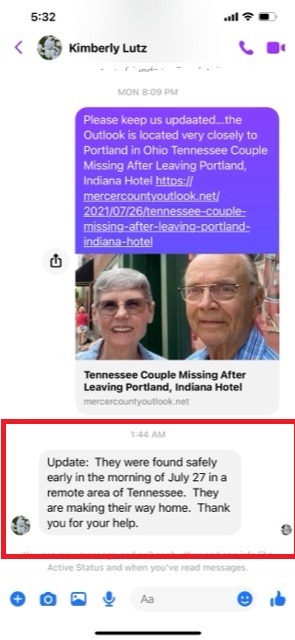 (7-26-21) Paul and Judy Ahrens, are missing. They checked out of a hotel in Portland, Indiana, at 8 a.m. on Sunday, July 25, and did not return to their home in Knoxville, Tennessee, as expected.