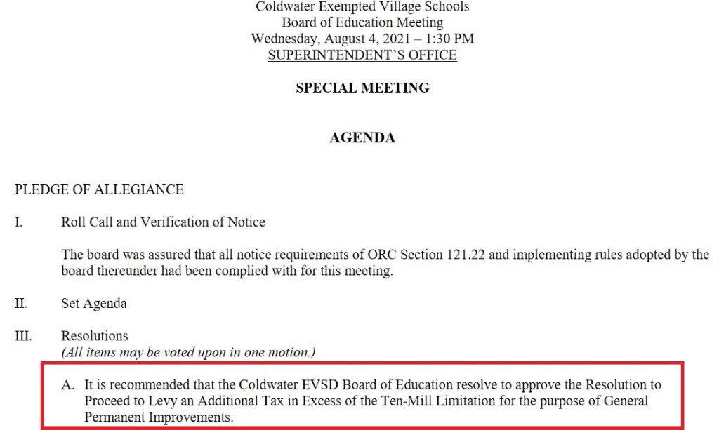 (8-3-21) Just in case the Coldwater School levy doesn’t passed today the Board of Education will meet to approve putting the issue back on the ballot in November’s election.