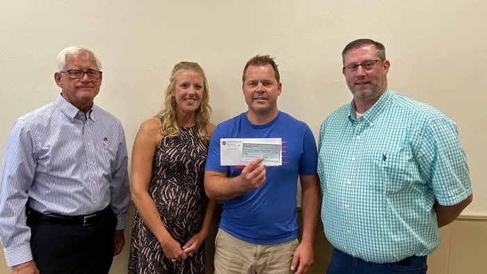 Midwest Electric Community Connection Fund board trustee Steve Butcher (right) presents a $1,000 check to the Marion Community Development Organization. Pictured here are Ted Bertke, Shannon Everman, and Nick Moeller. The funds will be used to build a 2.1 mile paved walking and bike path.