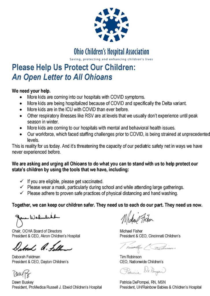 (9-14-21) Ohio Governor Mike DeWine in a press conference today want’s to encourage school’s to have students vaccinated and wear masks during the school day. His appeal comes after a notice from six Ohio Children’s Hospital’s encourage schools to consider.