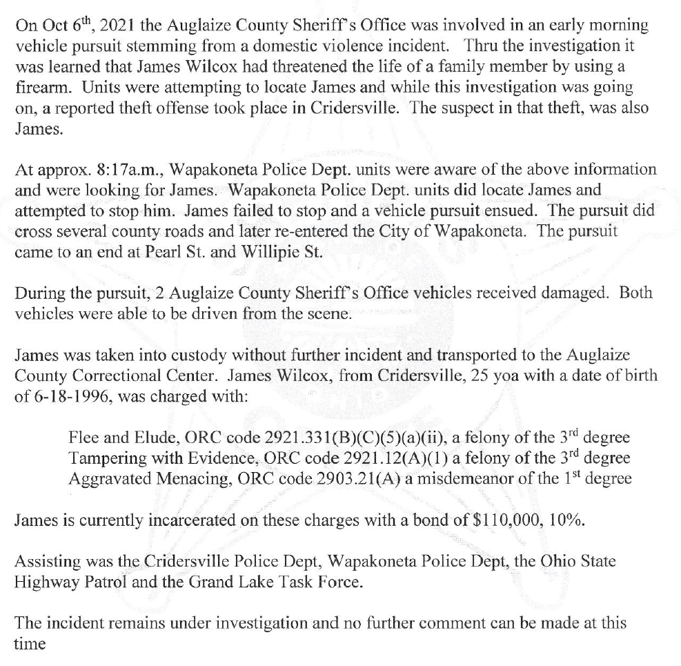 Arrests, local news Auglaize County Sheriff’s Office Involved In Vehicle Pursuit Date: October 6, 2021Author: statelinesportsnetwork 0 Comments James Wilcox Share this: Click to share on X (Opens in new window) X Click to share on Facebook (Opens in new window) Facebook Like Loading... Related