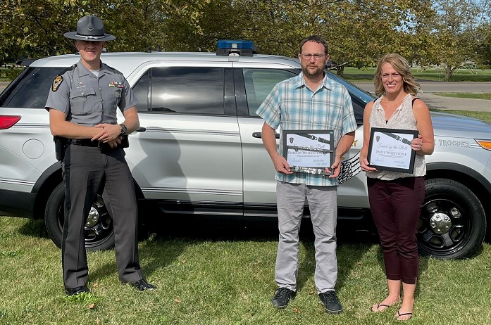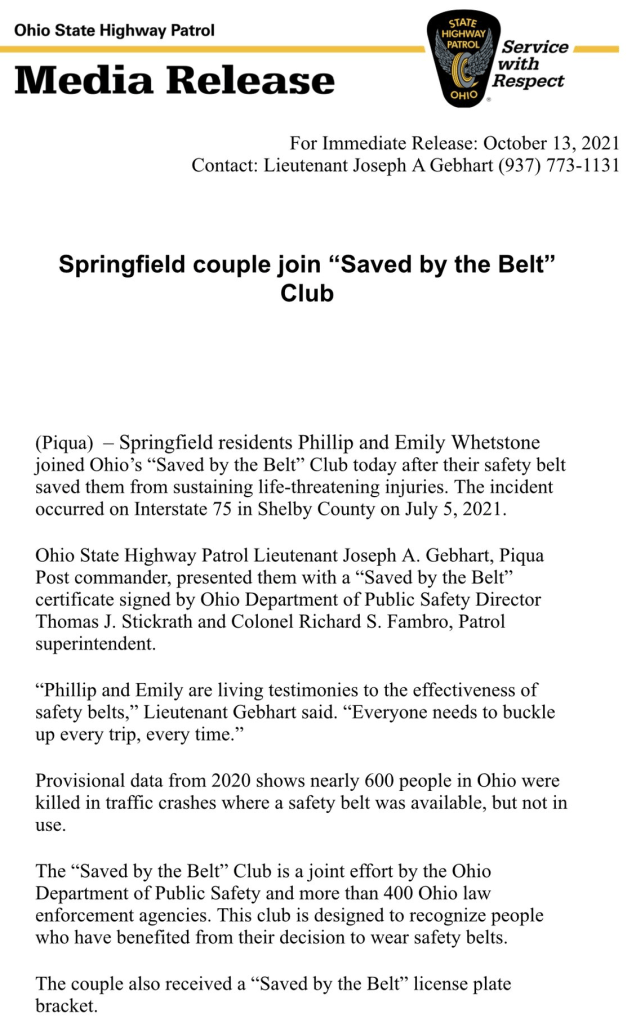 (10-14-21) Springfield residents Phillip and Emily Whetstone joined Ohio’s “Saved by the Belt” Club today after their safety belt saved them from sustaining life-threatening injuries. The incident occurred on Interstate 75 in Shelby County on July 5yj, 2021.