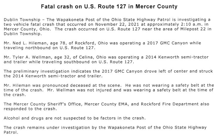 (11-22-22) Early this morning a fatal crashed claimed the life of a Rockford resident, Ned Hileman (78) after a collision on US 127 with a semi-truck driven by Tyler Wellman (32) of Celina.