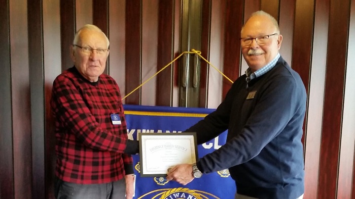 (12-20-21) At their 20th anniversary celebration, Celina Kiwanis President Dale Hart presented Hans Rehrmann with a Distinguished Service Award. Rehrmann is the club’s only remaining charter member. Lt. Governor Bob Day joined the club for this special occasion.
