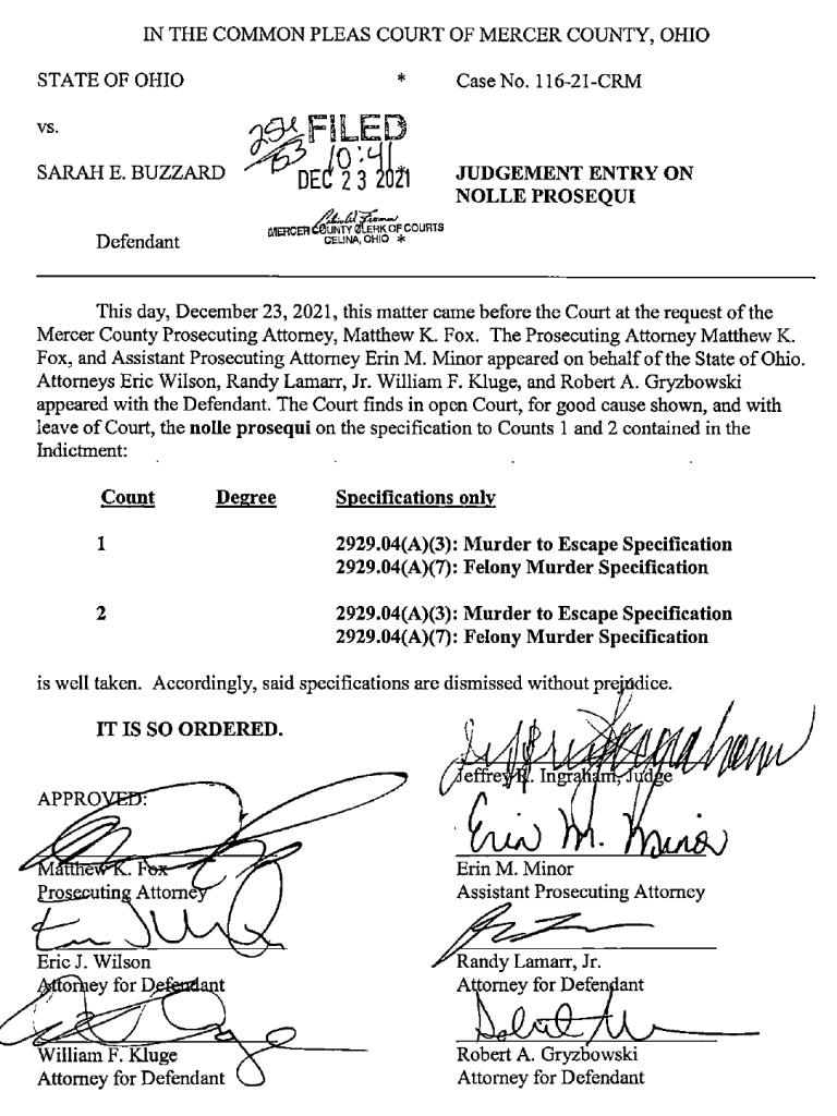 (12-23-21) This afternoon Sarah Buzzard (30) of Marion, Indiana pleaded guilty in Mercer County Common Pleas Court to one count of aggravated murder as part of a plea agreement with prosecutors in the murder of Ryan Zimmerman (21) of Columbus.