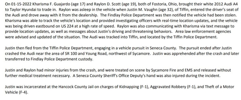 Arrests, Regional Stolen Vehicle-Kidnapping Starts In Findlay, Ends In Tiffin Date: January 15, 2022Author: statelinesportsnetwork 0 Comments (1-15-22) Two Fostoria teens took their Audi into a Findlay car dealership to trade in…that’s when the fireworks started. Share this: Click to share on X (Opens in new window) X Click to share on Facebook (Opens in new window) Facebook Like Loading... Related