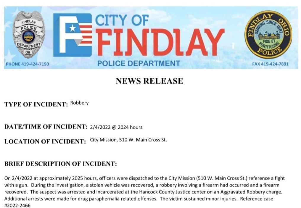 The incident took place around 8:30pm Friday night at City Mission in Findlay.