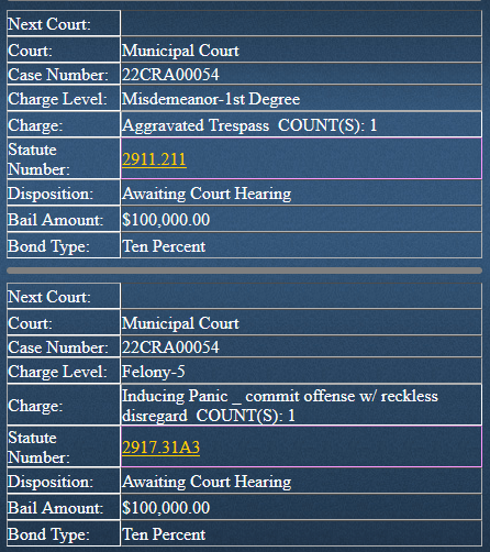 …including 3rd degree felony abduction, 5th degree felony of inducing panic, plus misdemeanor charges of aggravated menacing, criminal trespassing and and aggravated trespass.
