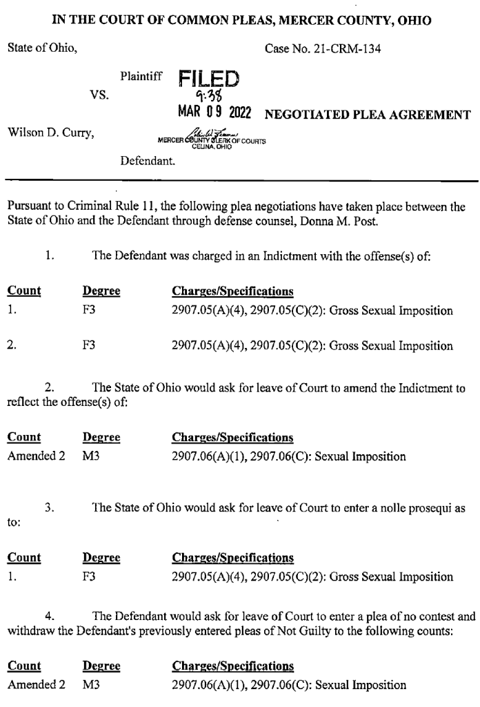(3-10-22) Wilson Curry (62) of Celina recently entered into a plea agreement in Mercer County Common Pleas Court with prosecutors in a case involving a local child under 13. He had had been indicted on two felony charges of gross sexual imposition. He was originally booked on November 5th, 2021 and released on 11-10-21.