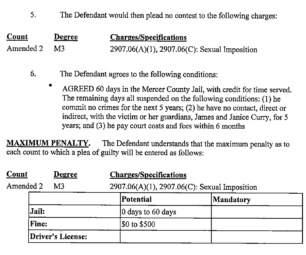 Curry pleaded no contest to a misdemeanor charge of gross sexual imposition and was sentenced to a 60 day jail sentence. The sentence was suspended on the condition that Curry does not commit another crime nor have any contact with the victim or the victim’s family.
