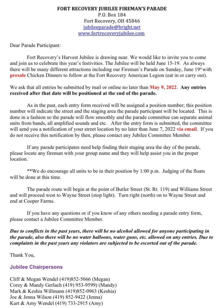 Community, local news Ft. Recovery Harvest Jubilee Parade Entry Application Date: April 24, 2022Author: statelinesportsnetwork 0 Comments (4-24-22) The 2022 Ft. Recovery Harvest Jubliee Parade is looking for participants for this year’s parade. Share this: Click to share on X (Opens in new window) X Click to share on Facebook (Opens in new window) Facebook Like Loading... Related