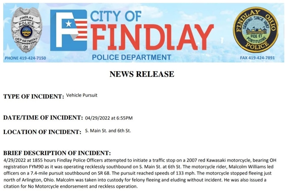 (5-1-22) Malcolm Williams (20) of Arlington was charged by the Findlay Police Department on Friday night with fleeing and eluding and was cited for reckless operation. In a 7 mile pursuit that started in Findlay and ended in Arlington included speeds of up to 133 mph.