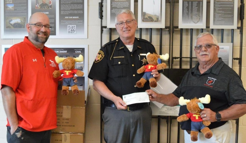 (5-13-22) The Celina Moose donated 4 cases of Tommy Moose dolls as well as a check for $1,500 towards the Mercer County Sheriff’s AED program.