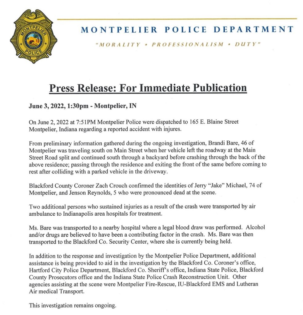 (6-4-22) A Montpelier man Jerry “Jake” Michael (74) and his young great-grandson Jenson Reynolds (5) were killed Thursday evening when a car left a city street and slammed into a local home (165 E. Blaine St.)