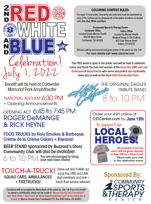 (6-7-22) Community Sports and Therapy Center is proud to announce that we will be sponsoring the second RED, WHITE, AND BLUE Celebration at Coldwater Memorial Park Amphitheater on Friday, July 1, 2022.
