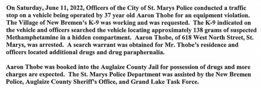 Arrests, local news, Uncategorized K9 Assists In St. Marys Drug Arrest Date: June 13, 2022Author: statelinesportsnetwork 0 Comments Thobe Share this: Click to share on X (Opens in new window) X Click to share on Facebook (Opens in new window) Facebook Like Loading... Related