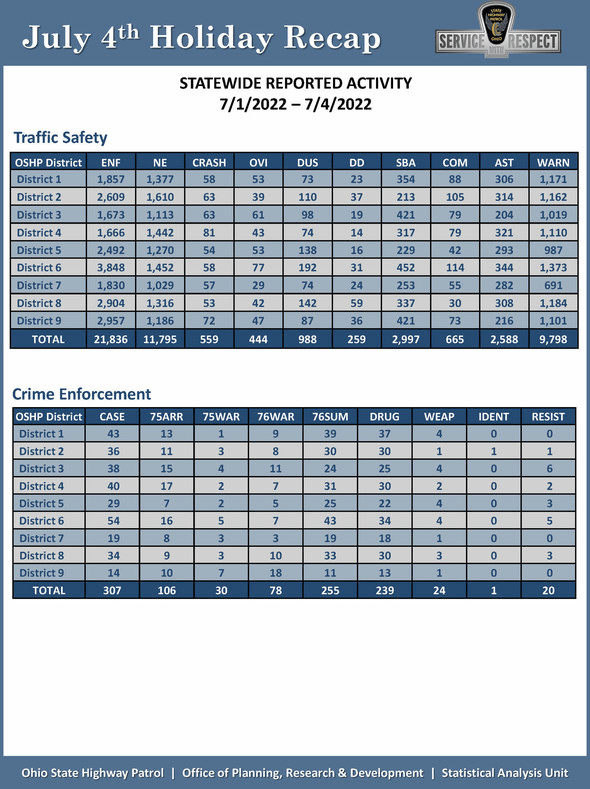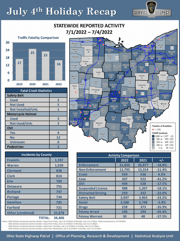 (7-5-22) The Ohio State Highway Patrol is reporting 16 people lost their lives in 16 traffic crashes during the July Fourth reporting period, which began Friday, July 1 and ended Monday, July 4. Impairment was determined to be a factor in four of those crashes.