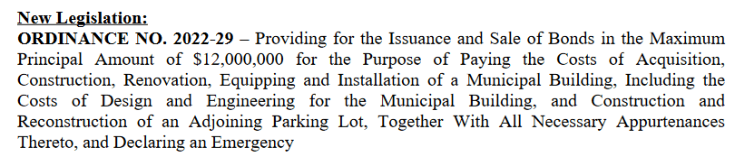 Members discussed an ordinance which would allow for the issuance of a $12 million dollar bond for the construction of a new municipal building at 101 West Spring Street in St. Marys, an adjacent parking lot, and a new park across the street near Skip Baughman Stadium. $10.5 million dollars would go toward the new building, $500,000 dollars toward the parking lot and the remaining 1 million dollars for furniture and fixtures.