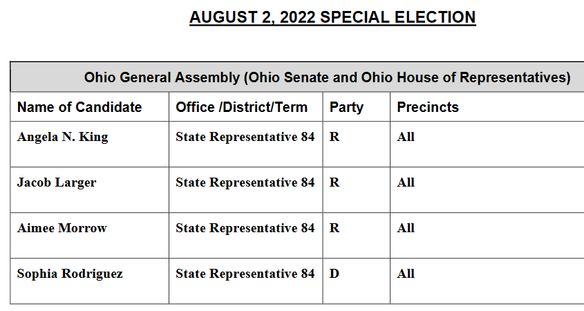Two other Republican candidates Jacob Large and Aimee Morrow will be on the ballot. The winner of the Special Election will face Democrat Sophia Rodriguez, who is unopposed on August 2nd in the November 8th General Election.