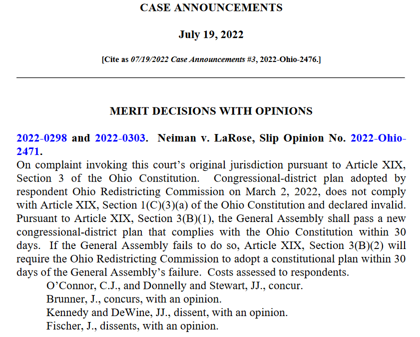 In a 4-3 decision, the Ohio Supreme Court majority ruled that the revised plan is similar to the one passed by the legislature in 2021 and ruled unconstitutional by the Court in January 2022. Today’s per curiam opinion stated the latest map, drafted by the Ohio Redistricting Commission, violated provisions of Article XIX of the Ohio Constitution because it “unduly favors” the Republican Party.