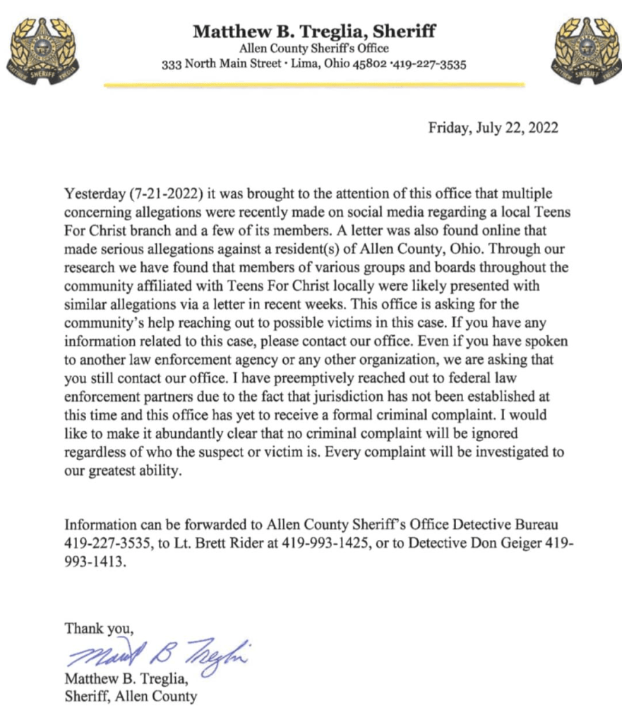 (7-22-22) Allen County (Ohio) Sheriff Matt Treglia is looking into allegations that have surfaced on the internet in recent days about a local Teens For Christ group. The Sheriff is asking anyone with information to contact his office.