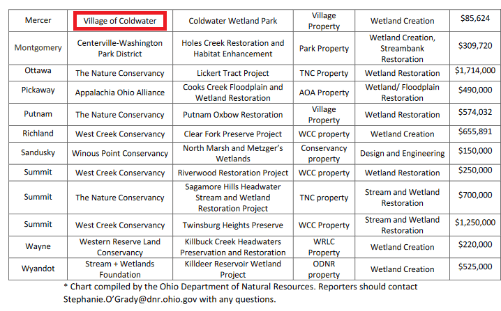 Twenty-five new wetland projects will soon launch in 22 counties including Allen, Athens, Butler, Clark, Clermont, Cuyahoga, Delaware, Franklin, Henry (2), Madison, Mahoning, Medina, Mercer (Coldwater Wetland Park), Montgomery, Ottawa, Pickaway, Putnam, Richland, Sandusky, Summit (3), Wayne, and Wyandot. The projects will be funded through ODNR’s $25 million H2Ohio allocation in the current state operating budget.