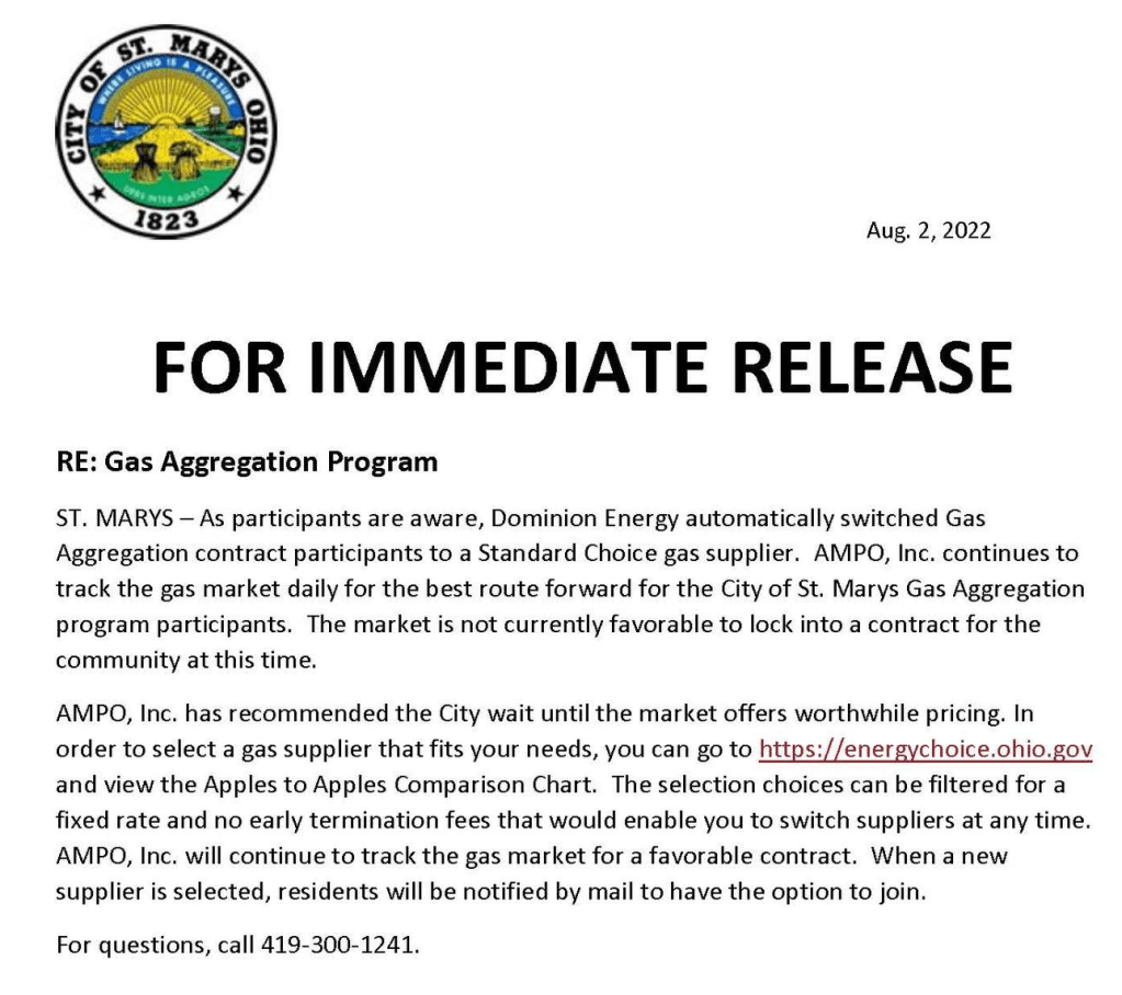 Community, local news City of St. Marys Gas Aggregation Program Update Date: August 2, 2022Author: statelinesportsnetwork 0 Comments Share this: Click to share on X (Opens in new window) X Click to share on Facebook (Opens in new window) Facebook Like Loading... Related