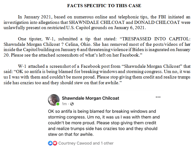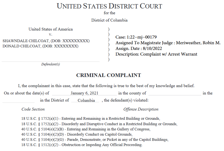 The complaint against the Chilcoats was filed in the Washington DC US District court and states that investigators acted on several tips that the Chilcoats were part of the insurrection and entered the US Capitol illegally.