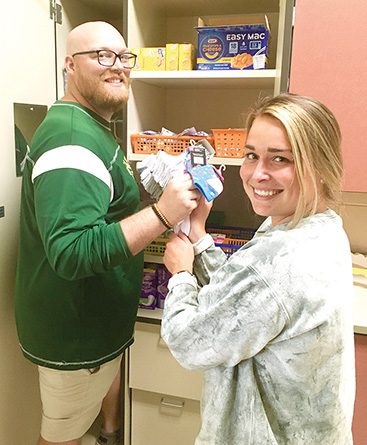 (8-15-22) Hamilton Middle School teachers Cole Freshkorn and Jenna Berry, who is a Celina native, help stock the HERO (Helping Every Ranger Out) Closet, which provides snacks, hygiene items, and clothing to students in need.