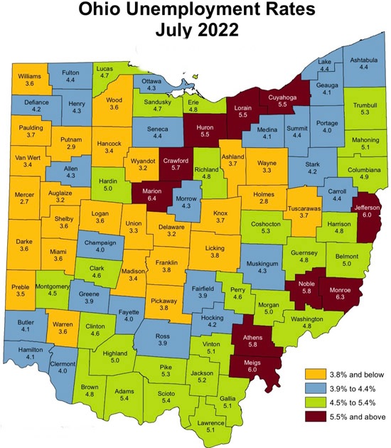 The 10 counties with the highest jobless rate last month were Cuyahoga, Lorain and Huron counties, 5.5%; Crawford County, 5.7%; Athens and Noble counties, 5.8%; Jefferson and Meigs counties, 6.0%; Monroe County, 6.3%, and Marion County, 6.4%.
