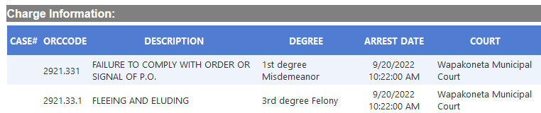 (9-21-22) Madison Rutschilling (31) of Celina was arrested Tuesday by the St. Marys Police on a 3rd degree felony charge of fleeing and eluding and a 1st degree Misdemeanor charge of failure to comply with the order or signal of a police officer.