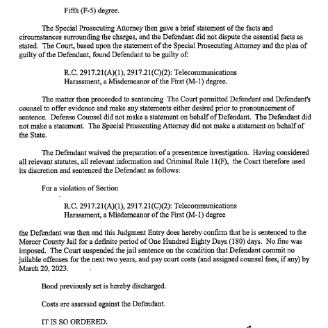 (9-23-22) Mark Burgoon (50) received a suspended 180 day jail sentence this week in Mercer County Common Pleas Court after pleading guilty to a 1st degree misdemeanor charge of telecommunications harassment.