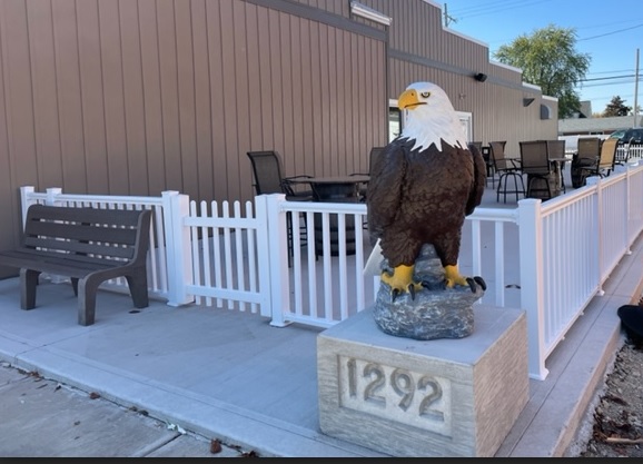 (10-26-22) The Fraternal Order of Eagles 1292 in Rockford recently completed a building project an addition of an outdoor social area. Eagles membership bought the property directly to the north of their Aerie which was once the Terrys Trim building. In 2021, after razing the building, they began construction of the outdoor area complete with concrete patio, decorative fencing, two entrances to the Eagles Lodge and large scenic windows that people can see out, but no one can see in. Tables and chairs complete the outdoor patio. Taller seating inside the building looks out onto the patio. The final piece was recently set in place by members a large concrete Eagle weighing over 600 lbs sits on a one ton concrete pedestal. Member Howie Courtney took charge of purchasing the Eagle and getting it painted with details. Dick Shaffer created the concrete pedestal with the Aerie number 1292 molded into it. The Eagles invite you to come by and take a look.