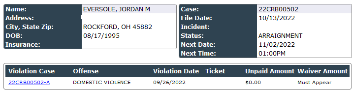 (11-2-22) Jordan Eversole (27) Rockford has been arrested for domestic violence stemming from an incident on September 26th.