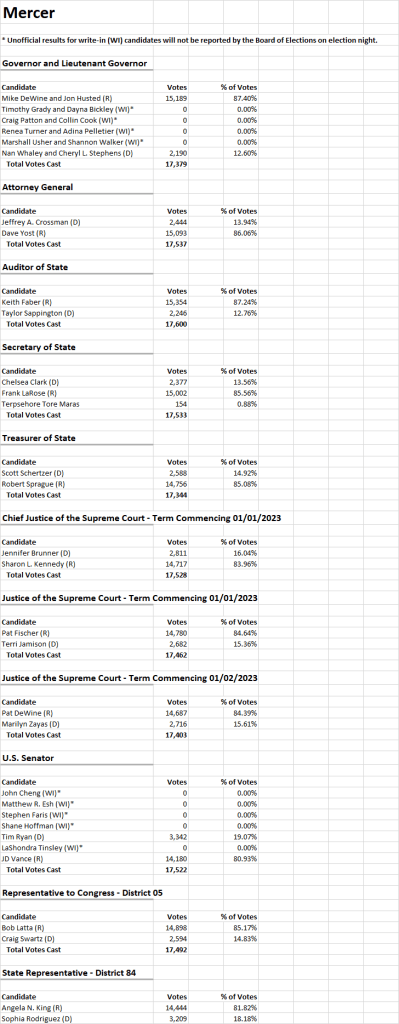 - Mercer County 36 of 36 precincts at 9:30pm (will post once state puts it on their website)