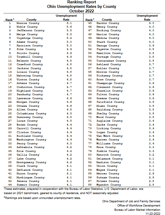 (11-23-22) Among the state’s 88 counties, preliminary October 2022 unemployment rates ranged from a low of 2.8% in Holmes County and Wyandot County to a high of 6.1% in Monroe County. From September, unemployment rates increased in 84 counties, decreased in two counties, and remain unchanged in two counties.