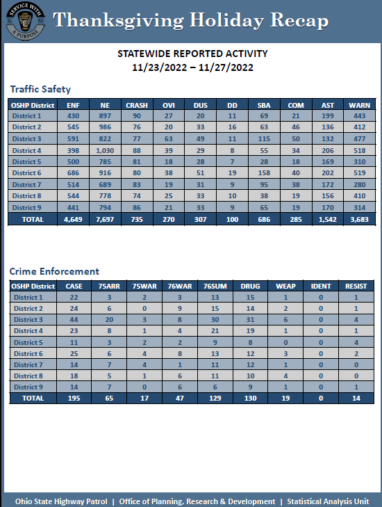 COLUMBUS (11-28-22) – According to provisional statistics from the Ohio State Highway Patrol, 16 people were killed on Ohio’s roadways this Thanksgiving holiday. During the five-day reporting period, from Wednesday, November 23 at midnight through 11:59 p.m. on Sunday, November 27, 16 people were killed in 15 fatal crashes. In 2021, there were 14 fatal crashes in which 17 people were killed.