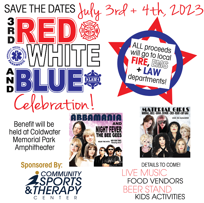 This upcoming year’s 3rd Annual Event will take place on the evenings of July 3rd and 4th, 2023 at Coldwater Memorial Park. The previous RW and B events were one-night events but in 2023 it will be a two-night celebration. July 3rd will feature live performances by Abbamania, the world’s number one production of Abba and Night Fever, who will bring the stage presence and harmonies of the Bee Gees. On the evening of July 4th, the Material Girls, featuring tributes to Shania, Annie Lennox, Lady Gaga, Adele, Madonna, Blondie & Cher will be performing. In addition to the live music, there will be food stands, kid activities, a beer tent, and more. Additional details will be announced. https://www.cstcenter.com/blog/rwb-donation-save-the-date