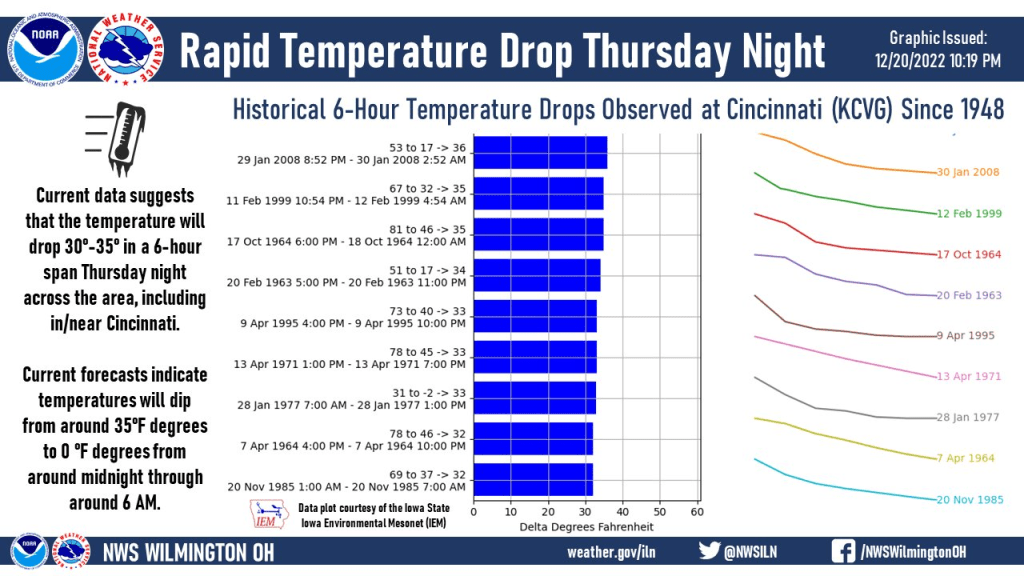 The NWS is growing increasingly concerned about the potential for a flash freeze Thu night, esp. as precip is expected along the front. Temps may dip as much as 35 degrees in any one location in a 6-hr span early Fri AM, which is close to historical records in the area.