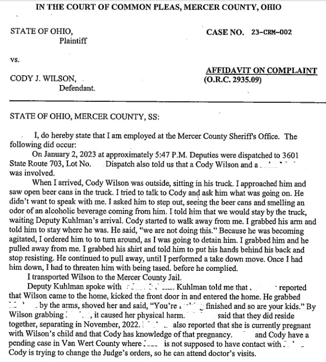Wilson is currently out on a $50,000 bail (10%) while he awaits his hearing in Mercer County Common Pleas Court, where he also faces a charge of obstructing official business and resisting arrest. He is also subject to an open container charge in a motor vehicle that will be held in Celina Municipal Court.